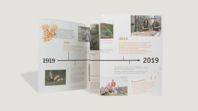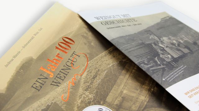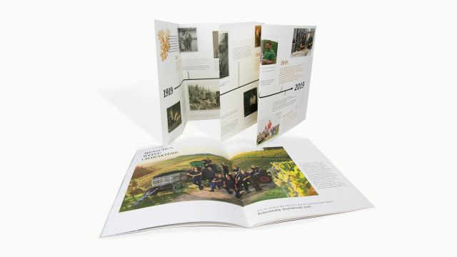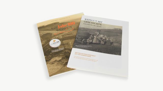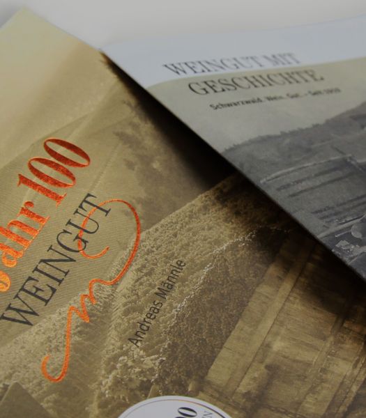 Die Unternehmensbroschüre, mit edler Kupferprägung, gibt Einblick in das Weingut, in dem seit 100 Jahren eine Familie wirkt. Eine kleine Zeitreise kann der Betrachter im beigelegten Leporello begehen, der die historischen Ereignisse der vergangenen 100 Jahre, die Chronik des Weinguts, erzählt.